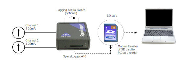 Data is stored on a removable memory card (included), enabling remote data logging without the need for direct connection to a PC. After logging, the memory card can be simply inserted in a card reader to view and analyse the data on a PC; no special software is required.