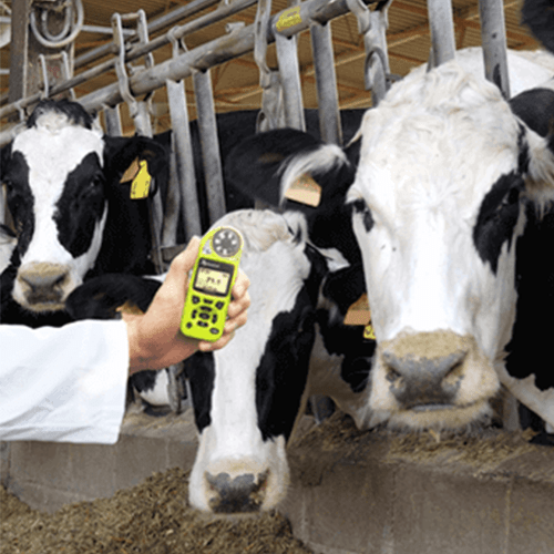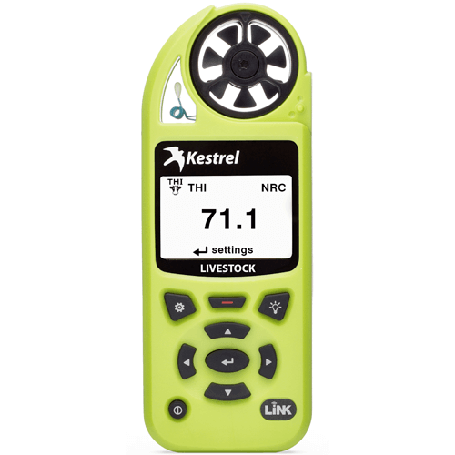 THI, (Temperature-Humidity Index) has been used for decades as a measure to classify heat stress risk in many livestock production and transportation operations. This measurement includes both temperature and relative humidity and is a basis for both strategic and tactical management practices which benefit animal health, productivity and well-being. The Kestrel 5000AG calculates and logs on-site THI based on user selection of either the NRC (National Research Council, 1971) or Yousef (Yousef, 1985) accepted THI calculations. Objective and accurate site-specific measurements are critical to ensuring a heat stress management strategy that is cost effective; and they’re at your fingertips with the 5000AG.