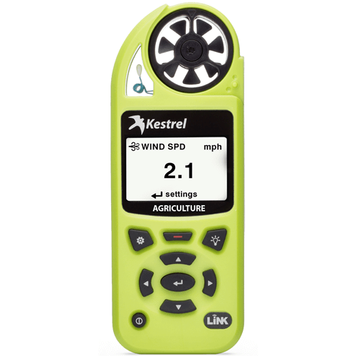The Kestrel 5500AG calculates Delta T measurements for determining acceptable spraying conditions. Delta T uses ambient temperature and dew point to provide guidance on the evaporation rate of sprayed chemicals, so you can select the best time and spray nozzle. The Kestrel 5500AG combines Delta T, wind speed, and direction with average wind speed and maximum wind gusts automatically ensuring the data is readily at hand to determine safe crop spraying conditions and manage spray drift.